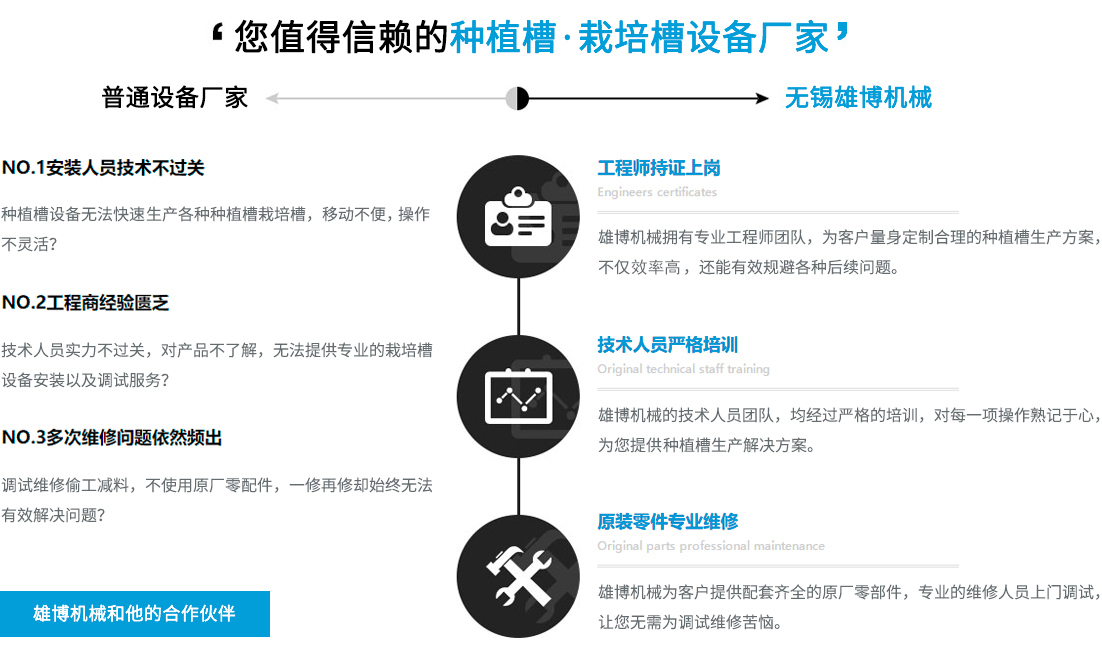 您在選擇雄博產(chǎn)品的同時,也選擇無微不至的終身服務。可根據(jù)不同客戶實際需求進行種植槽設(shè)備,栽培槽設(shè)備等的特殊工藝設(shè)計制造專業(yè)一對一售前/售后/技術(shù)咨詢指導,享受更貼心/放心的設(shè)備使用體驗。